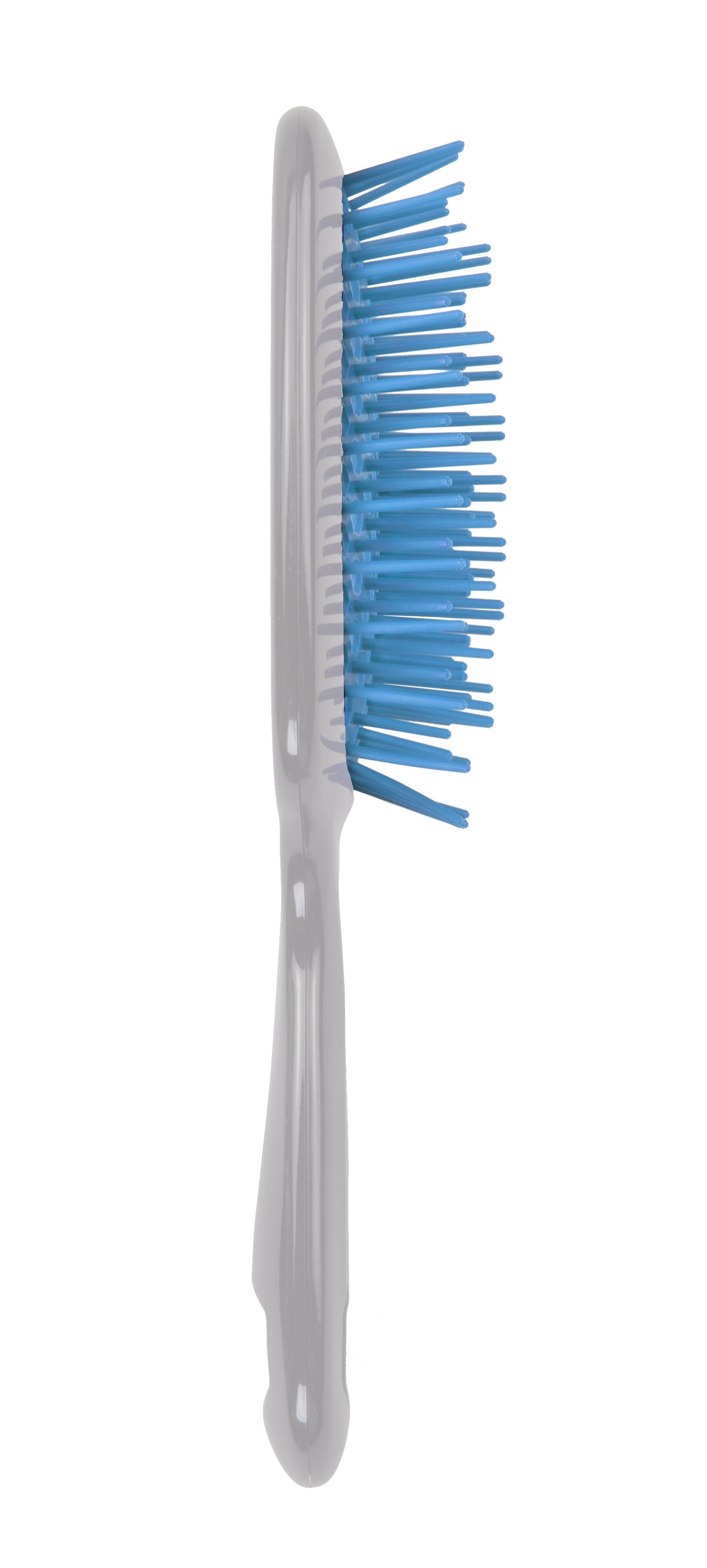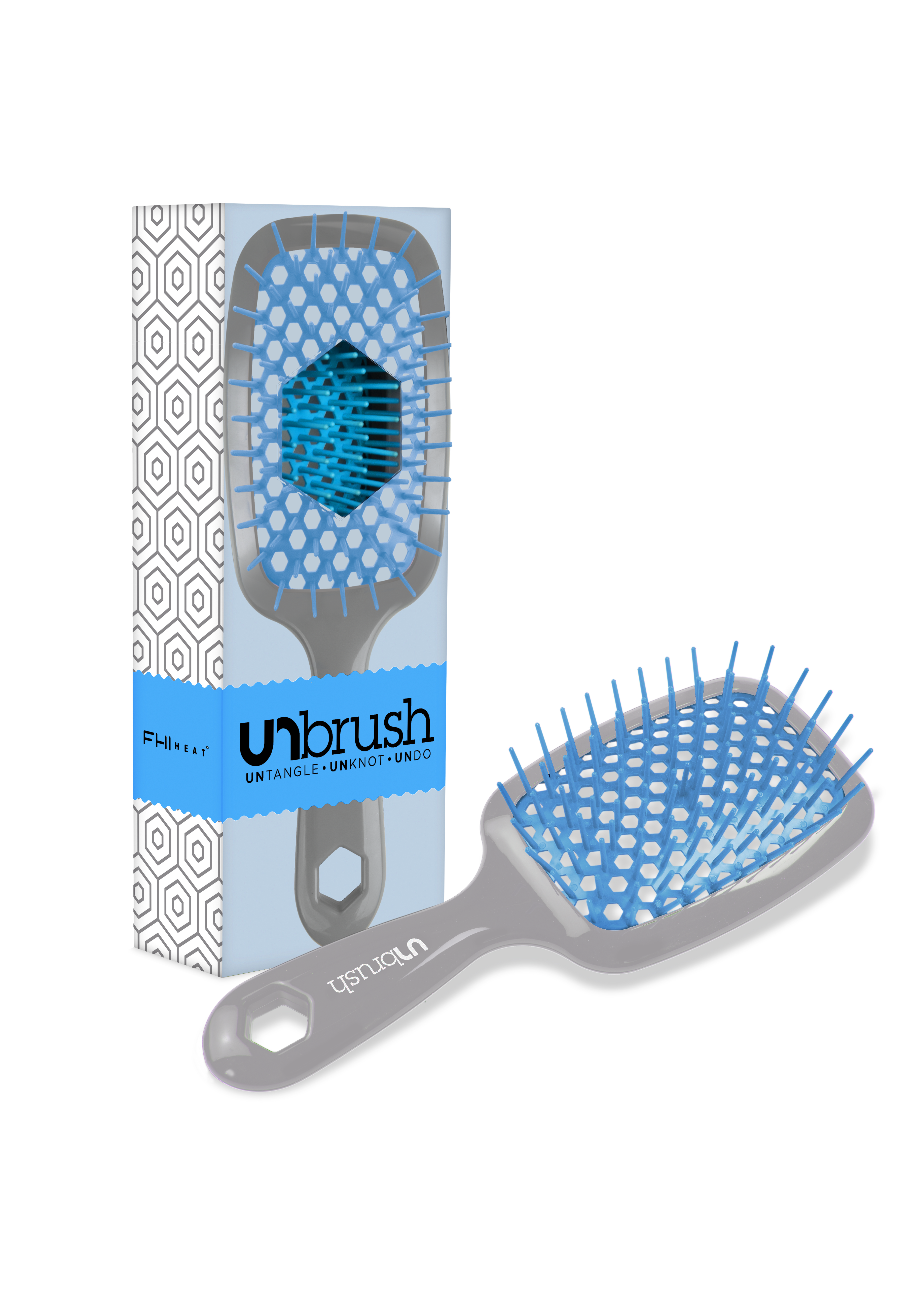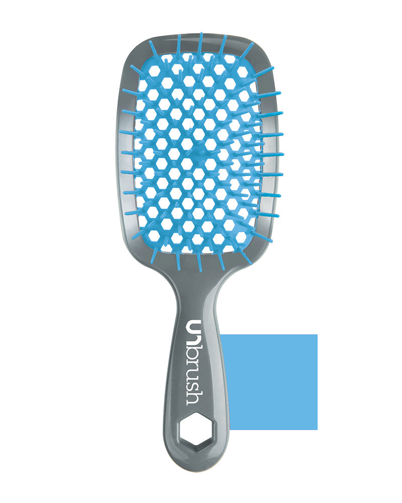 UNbrush - Sky Blue gently yet thoroughly extracts knots and tangles from even the most unruly hair, painlessly and effortlessly. Unique vented cushion reduces blowdry time by 48%! Prevents hair from catching. Works equally great on wet or dry hair.